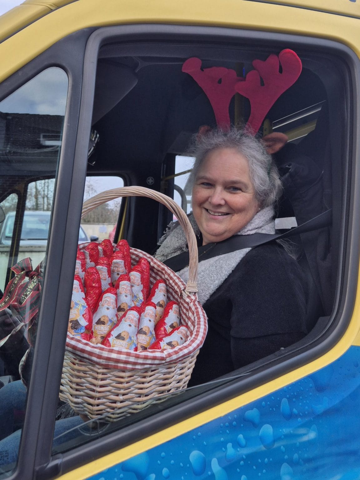 Birgit Voß macht sich bereit, ihren Fahrgästen am Freitagnachmittag die Schokoladen-Nikoläuse zu überreichen.